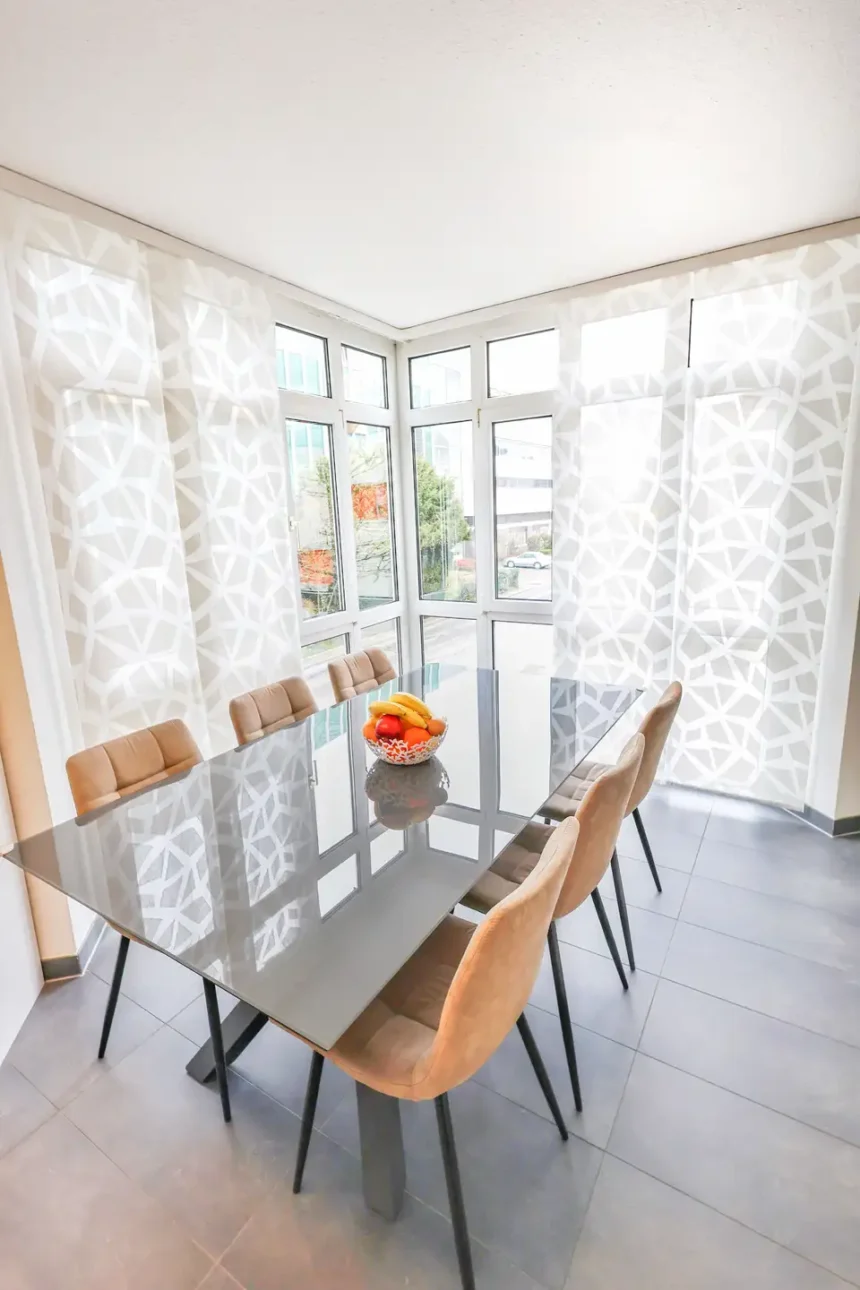 - Neutrale Vorhänge und Teppiche, die Wärme ausstrahlen